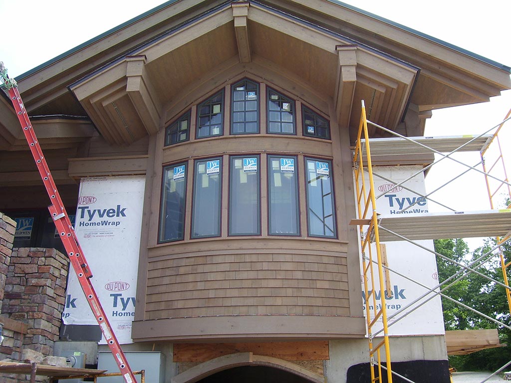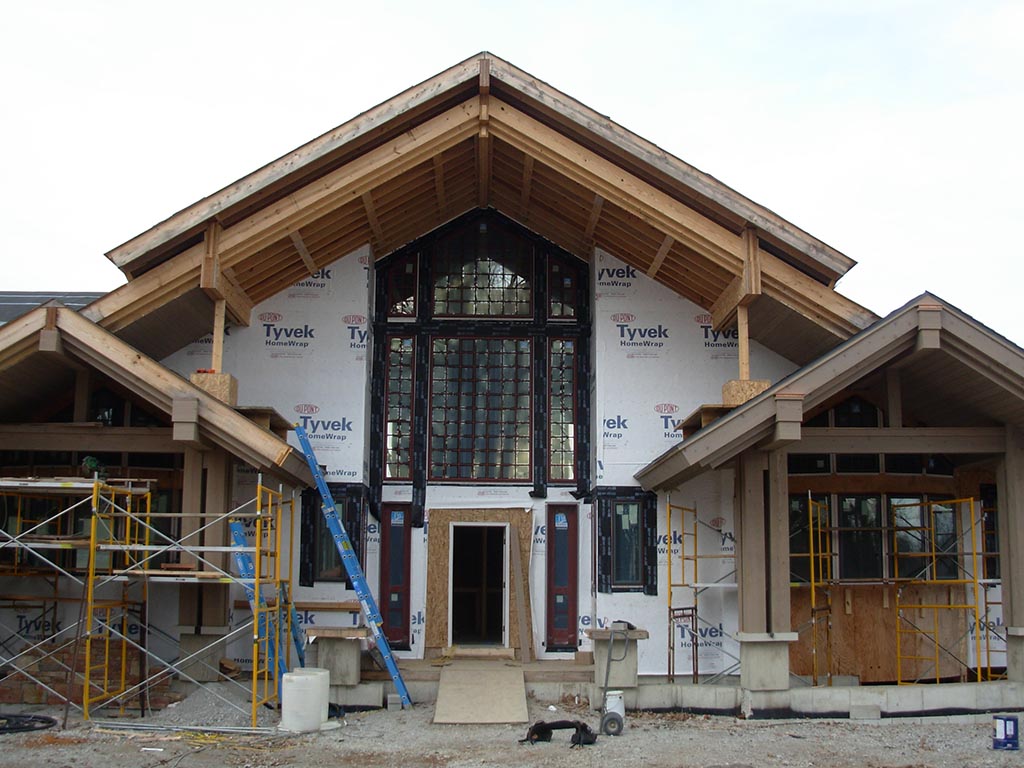 This home was created using hybrid timber frame design and conventional stick framing with modern engineered beams. The home is built to resemble a lodge home you may see out West. No detail has been spared. Some of the interior features are hand hewn beams crafted on site. These beams are 10" squared Douglas Fir solid beams continuous from basement to the loft. The exterior has three tiered overhangs with hidden gutters inside (no problems with freezing). Please call or come see us for your new home design.